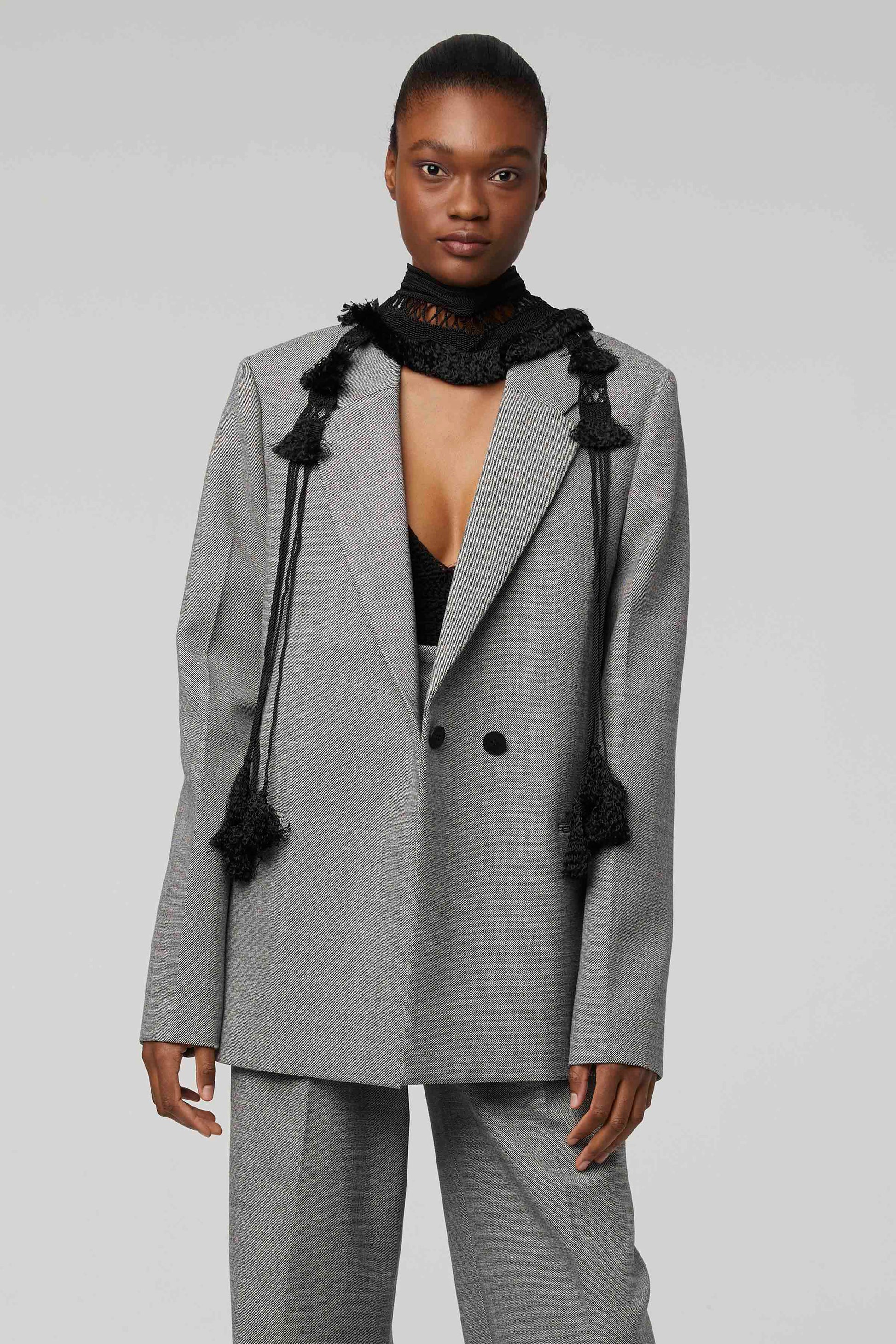 The 'Proteus' jacket is tailored from wool and recycled fibers into a timeless double-breasted silhouette with notched lapels. Cut for a slighly oversized fit, the jacket falls to an elegant below-hip length.