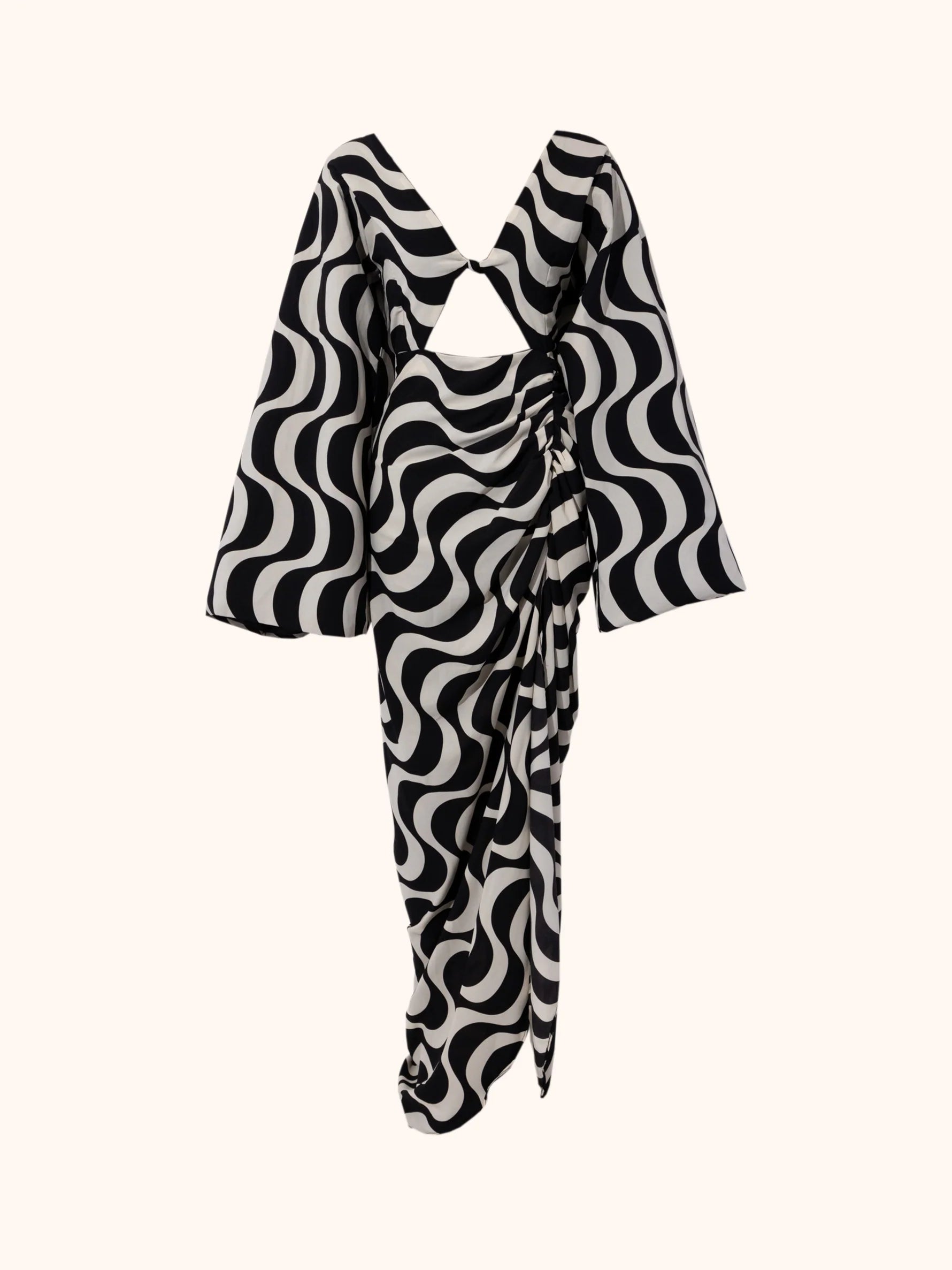 Deep V-neck dress with maxi flare sleeves.